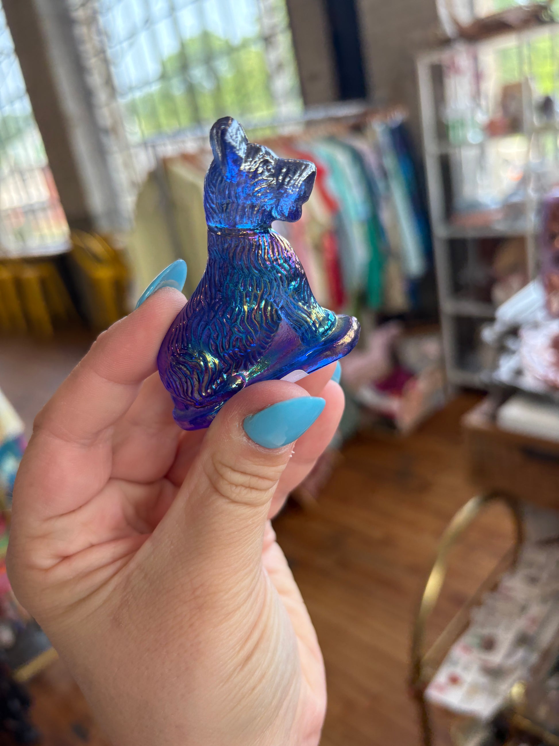 A mini pressed glass Scottie in a dazzling blue carnival finish.