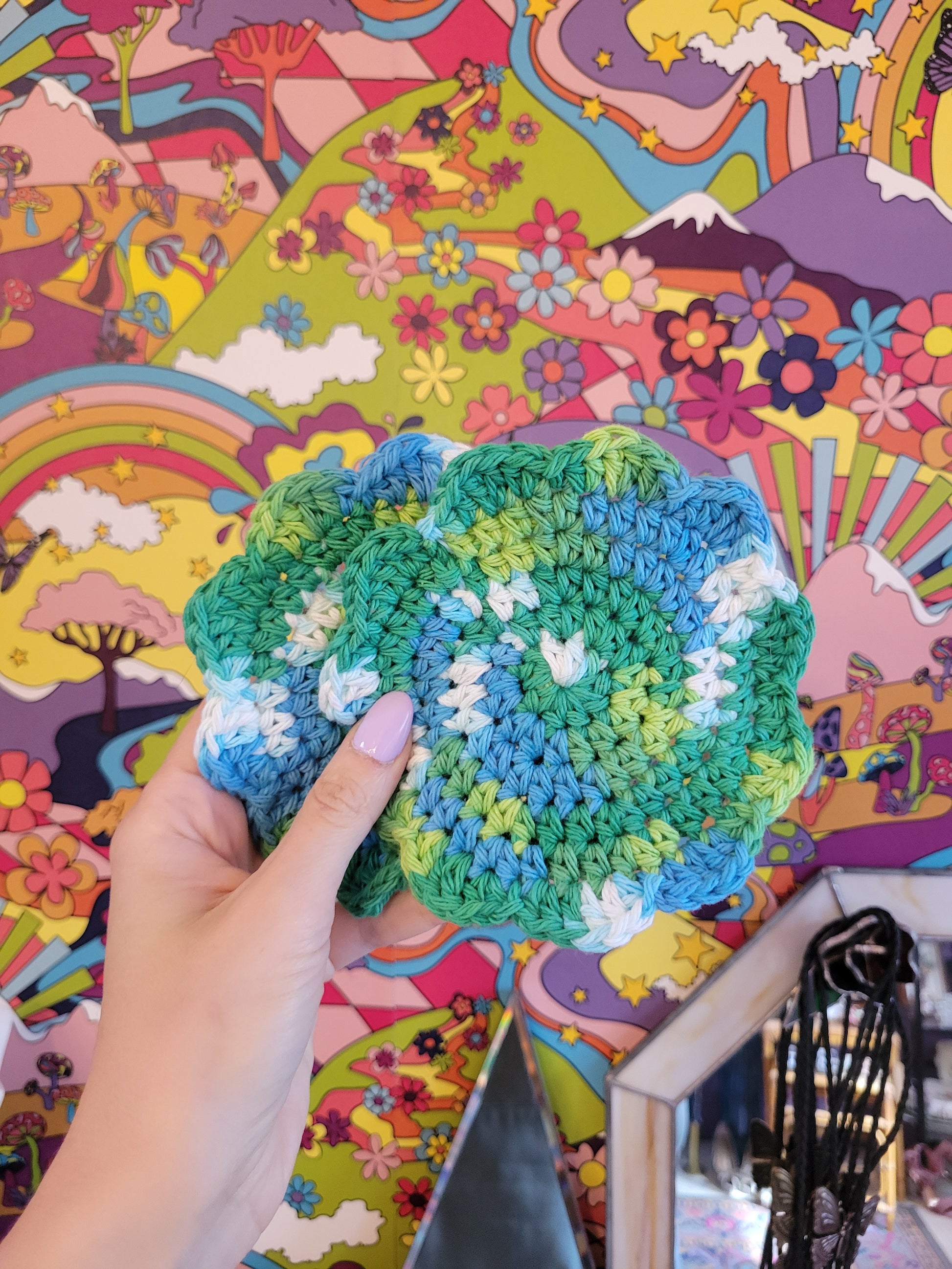 Handmade crochet Flower Power Coasters made by @beaten.path.vintage🌸